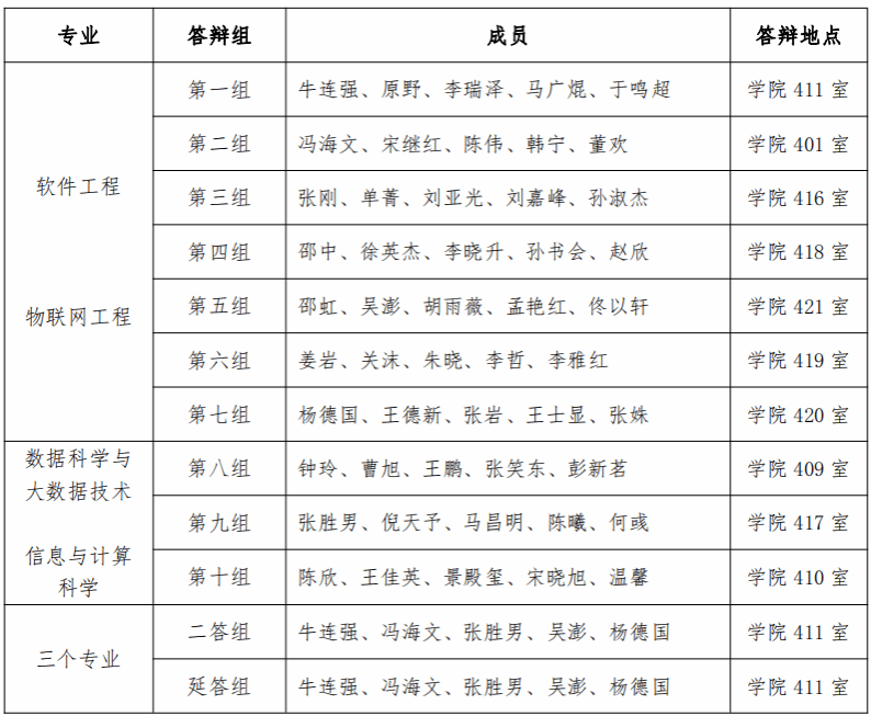 本次答辩软件工程、数据科学与大数据技术、物联网工程、信息与计算科学四个专业共设置答辩组10个、二次答辩组1个、延期答辩组1个,答辩委员会组成详见下表。