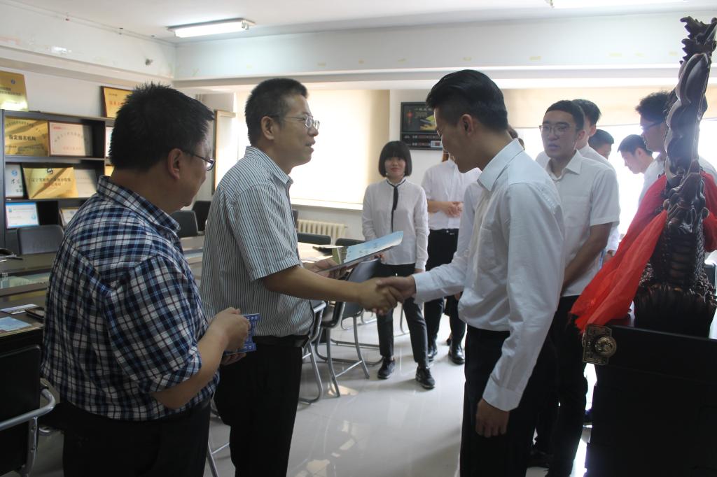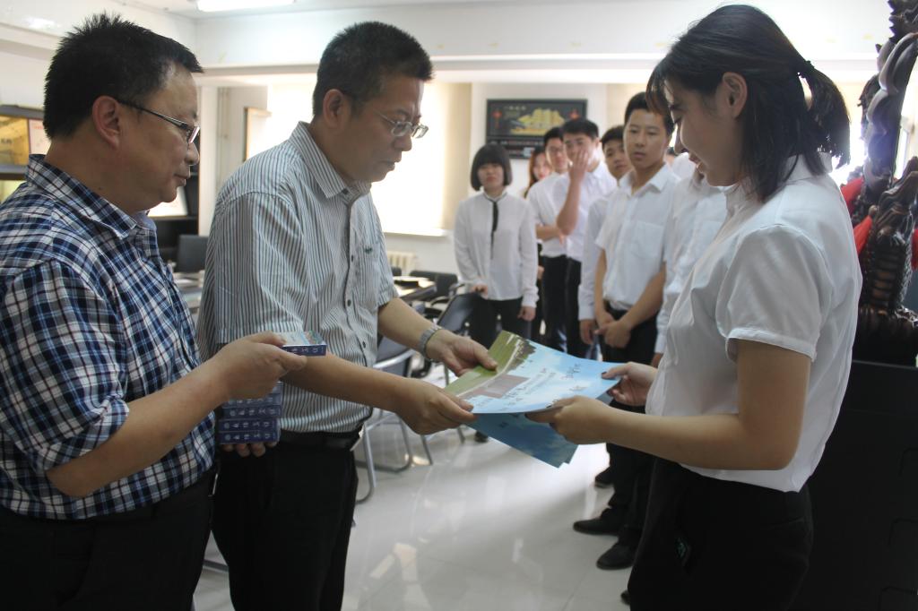 2018届员工理事会秘书长张晋源同学代表届全体毕业生对学校的培养表示感谢,并送上《一帆风顺》工艺品,以此祝福母校蓬勃发展。最后,学院领导为所有理事颁发聘书,并送上为每名员工定制的姓名钥匙扣,祝愿毕业生前程似锦,鹏程万里。
