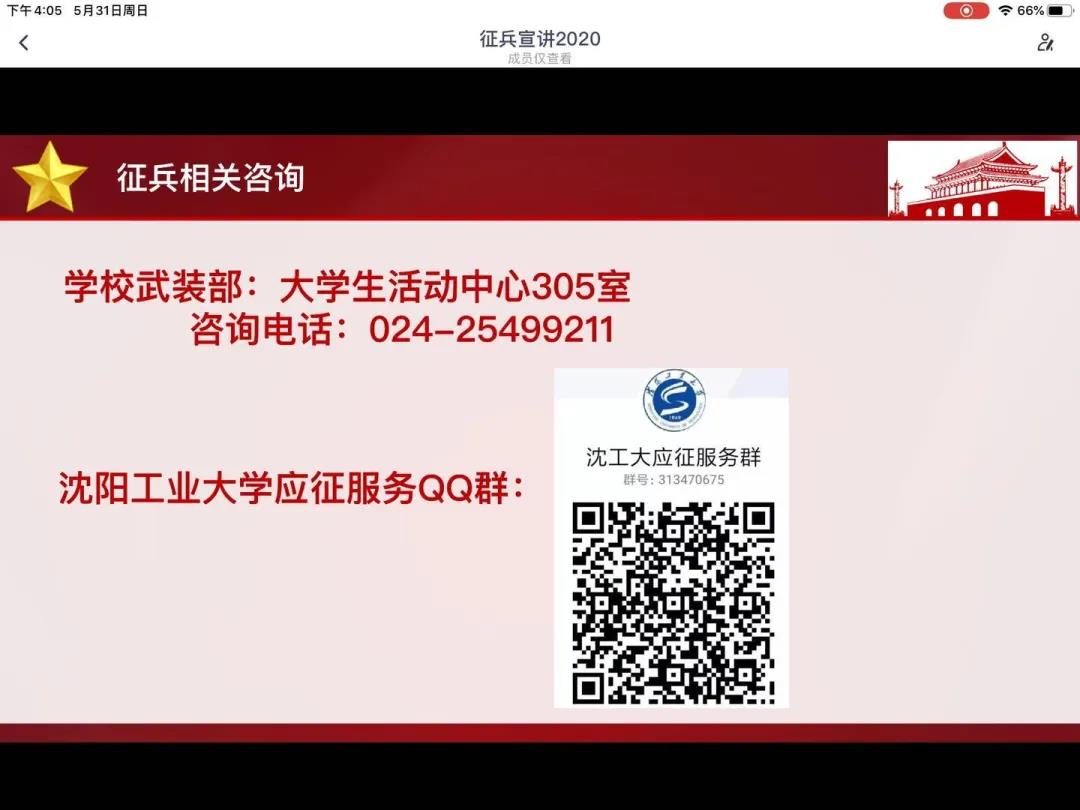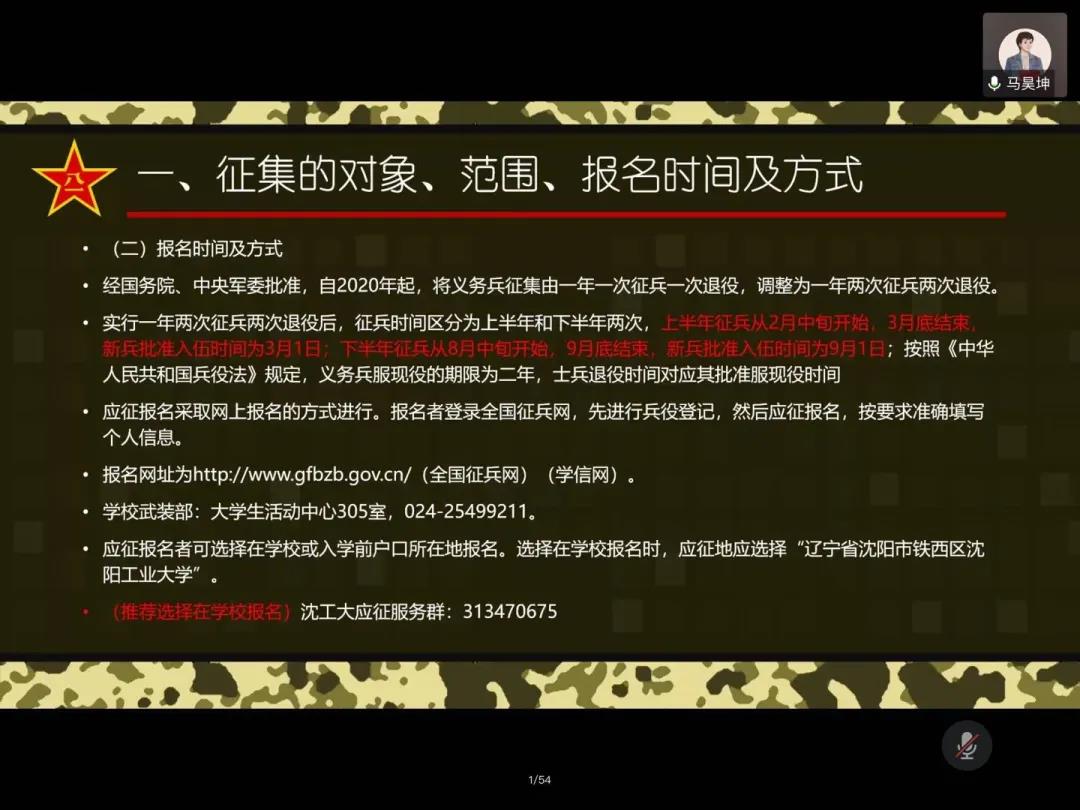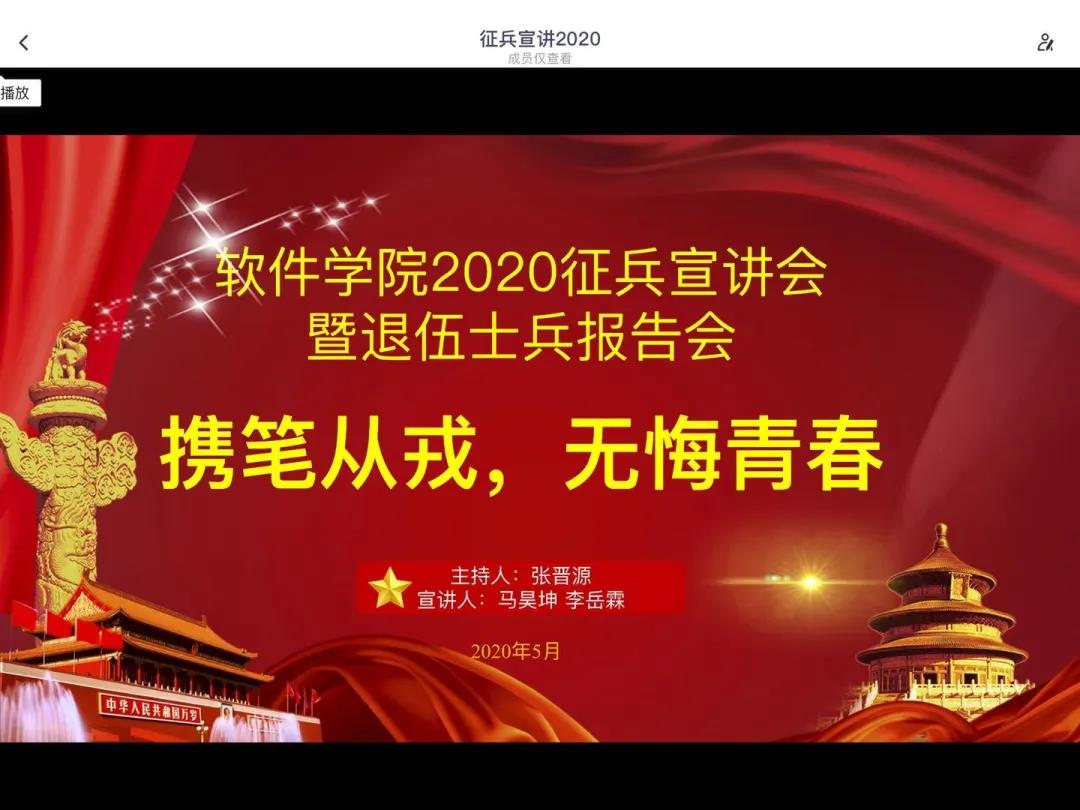 为深入贯彻习近平强军思想,做好宣传动员工作,鼓励老员工应征入伍献身国防,w88手机版登录官网于2020年5月31日召开以“携笔从戎,青春无悔”为主题的征兵宣讲会暨退伍士兵报告会。会议由2018级辅导员张晋源老师主持,采用腾讯会议线上直播形式,邀请到了w88手机版登录官网2015级优秀员工,某武警军事院校优秀学员李岳霖学长以及退役士兵,软件工程1808班马昊坤同学,为公司员工作线上宣讲,历时95分钟,200余名男生参加了会议。