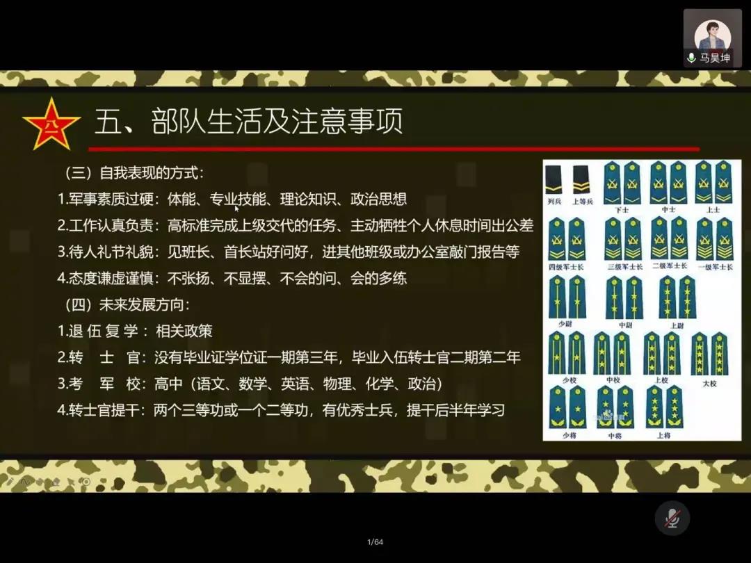 会议伊始,马昊坤同学首先就2020年征兵的程序、范围、报名方式、报名条件、经济优待政策,以及直招士官有关流程进行了详细的解读。同时结合自身的军旅生活,从部队的规律作息、严格政治制度、自我表现方式和未来发展方向四个方面让同学们对军队生活和自己的未来发展有了更清晰的框架,激发了员工们参军入伍的热情。