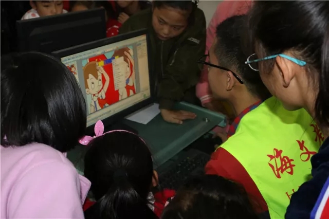 在确保所有孩子们都听懂后,开始让孩子们进行实际操作练习。孩子们有不懂的问题或者错误的地方,志愿者们会进行及时的讲解与指导,耐心的重复着一次次的操作。最后,孩子们看着自己做出的幻灯片心满意足,志愿者们也露出了满意的笑脸。